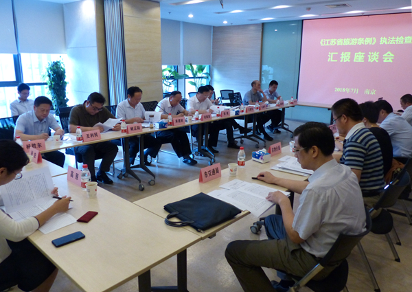 座谈会上,市旅游委汇报了《江苏省旅游条例》贯彻实施情况,市公安局、物价局、工商局、交通局等部门分别从各自职责的角度作了补充汇报,执法检查组有关成员发表了意见建议,市政府吴秀亮副秘书长就执法检查组提出的意见建议作了具体回应。司锦泉副主任对我市执法检查工作和省旅游条例贯彻实施情况给予了肯定,他希望我市进一步贯彻落实《江苏省旅游条例》精神,依法加强旅游市场监管,积极开发利用旅游资源,为促进全省旅游业高质量发展作出新的贡献。