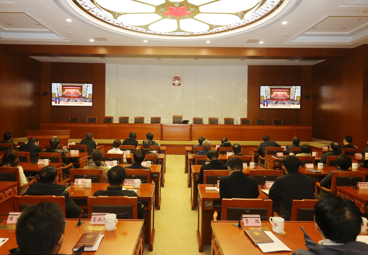 3月5日上午9时,十四届全国人大三次会议在北京人民大会堂开幕。市人大机关组织收看大会开幕盛况。市人大常委会副主任杨学鹏、胡万进、许明、谈健参加。